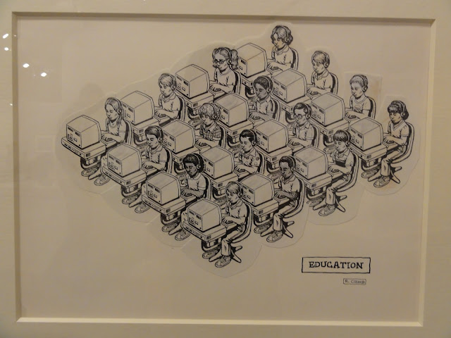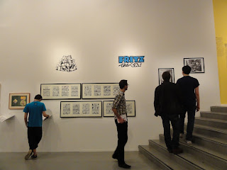 Je me focaliserai donc sur ce que j'ai retenu de l'expo, c'est à dire: Robert Crumb est un sacré pervers. Ce à quoi on me répondra "comme nous tous" (comme me l'a fait remarquer quelqu'un sur place), mais je ne sais pas si nous sommes tous névrosés à ce point. Ceci dit, il a regard très juste et aiguisé sur notre société, il possède également beaucoup de recul sur lui même, ce qui adoucit un peu son portrait.